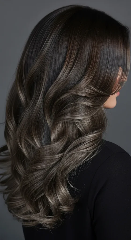 For a cooler tone option, smoky brown highlights create an elegant contrast against dark hair. The result is subtle yet sophisticated, making it ideal for women who prefer neutral or ash-based brunette shades.