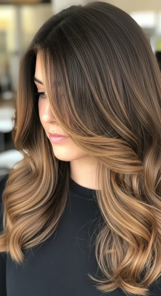 Caramel-brown highlights painted over deep brunette strands bring warmth and glow. This balayage look is perfect for women who want noticeable dimension without going blonde. It also works beautifully with beach waves or soft curls.