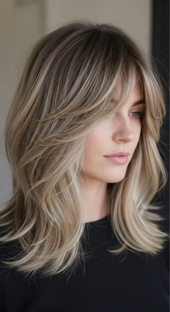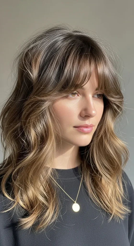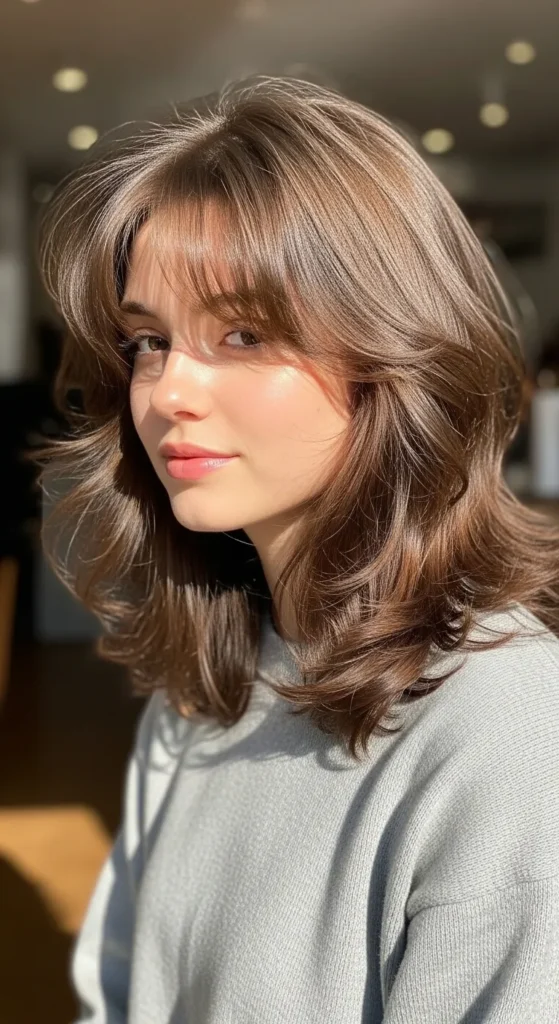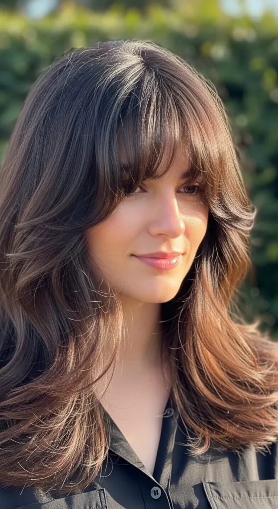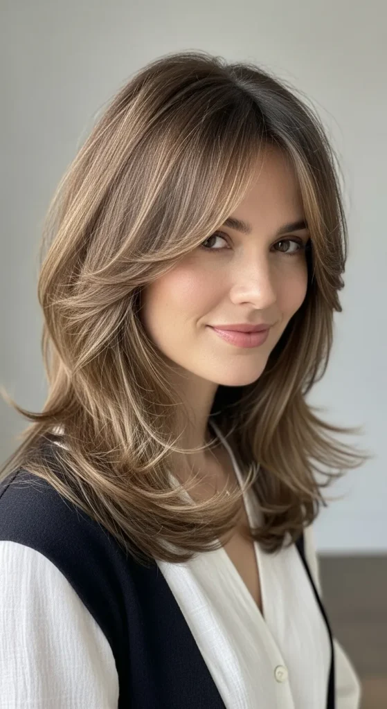 Long curtain bangs blend beautifully into medium layers, creating a smooth transition. This style is versatile and flattering across face shapes.