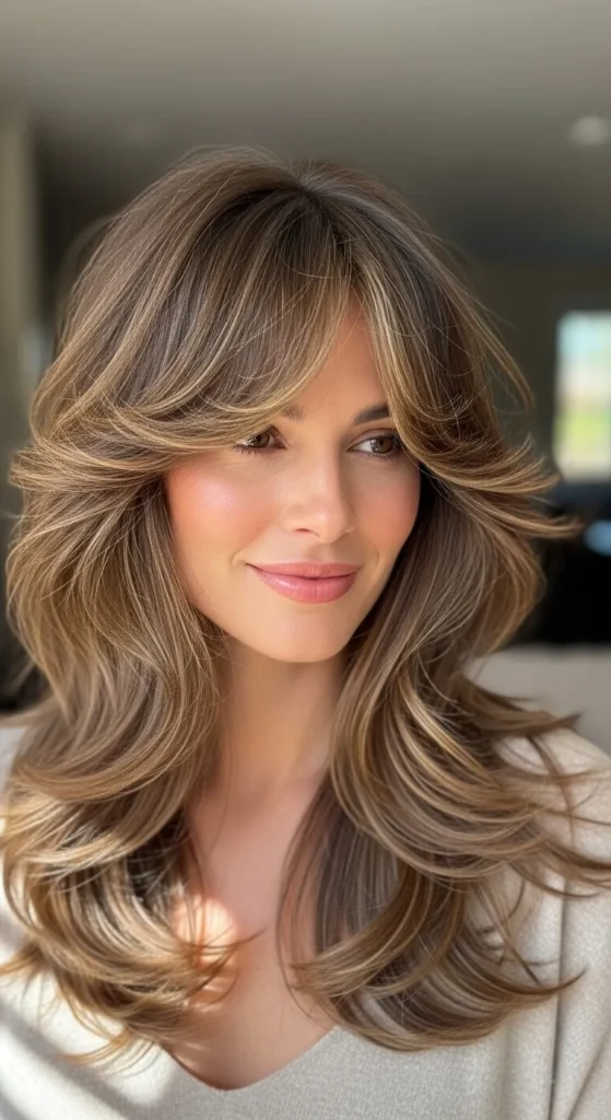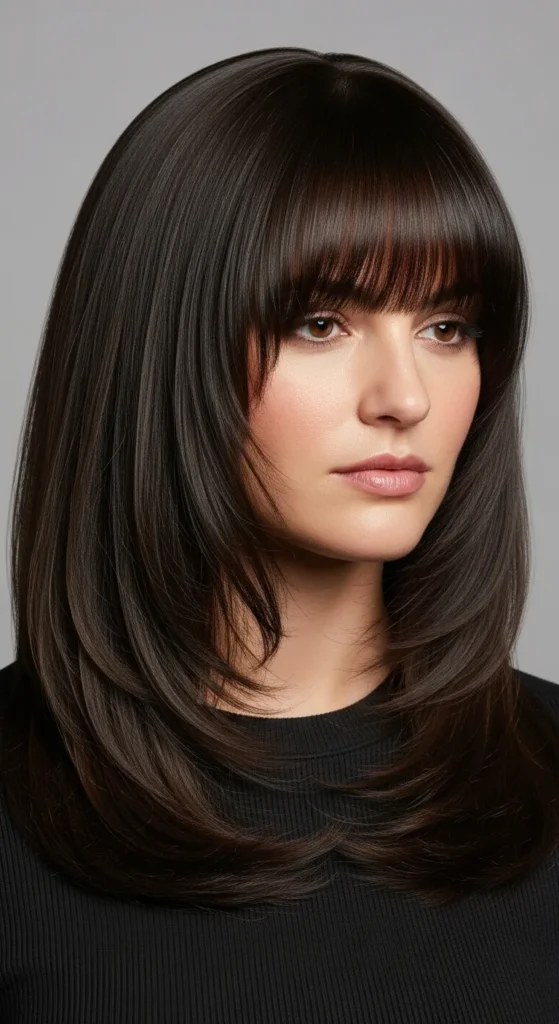 This style is perfect for special occasions or workdays when you want extra polish. Layers support volume, and curtain bangs styled with a round brush add drama.