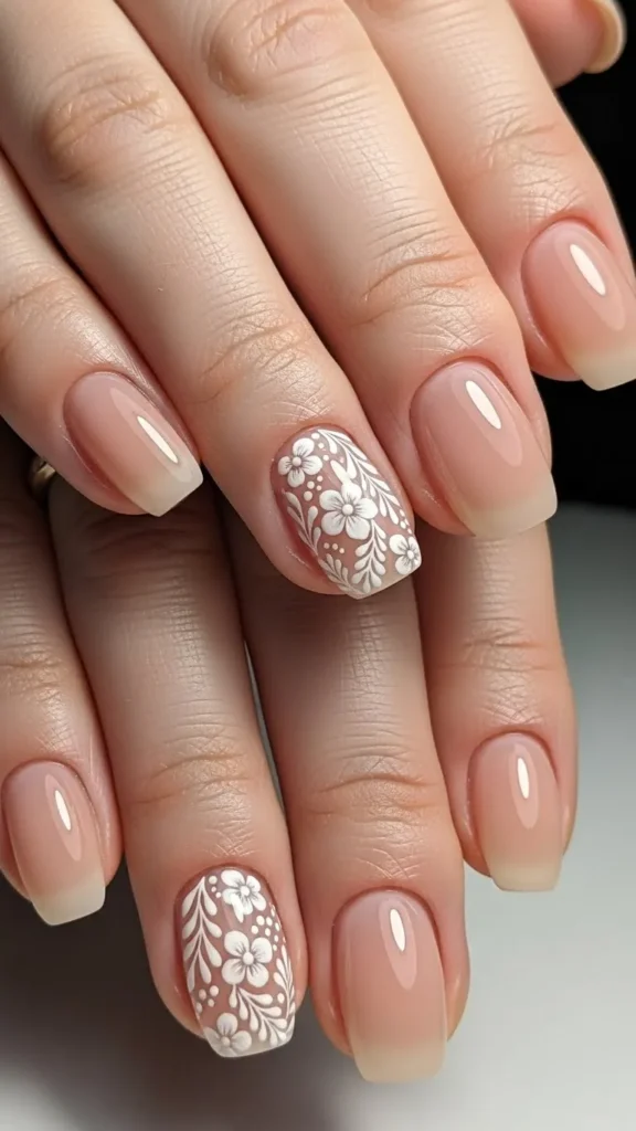 Keep most nails neutral and add a small floral design on one or two fingers.