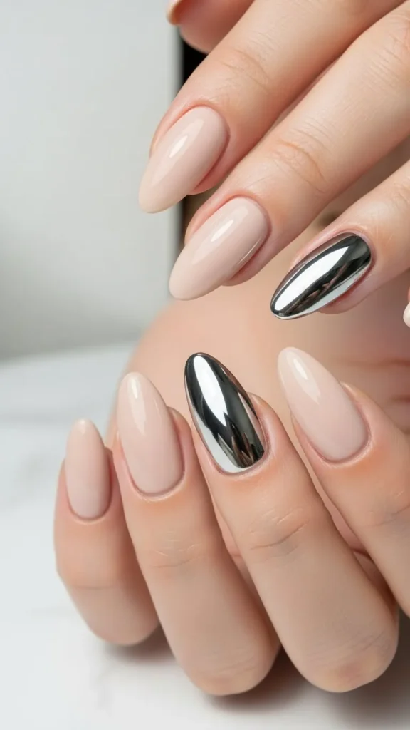 Inspired by celebrity nail trends, this look uses sheer nude polish topped with a pearl chrome finish.