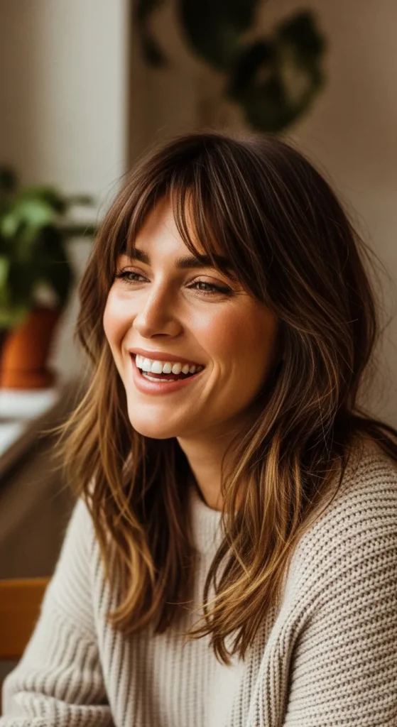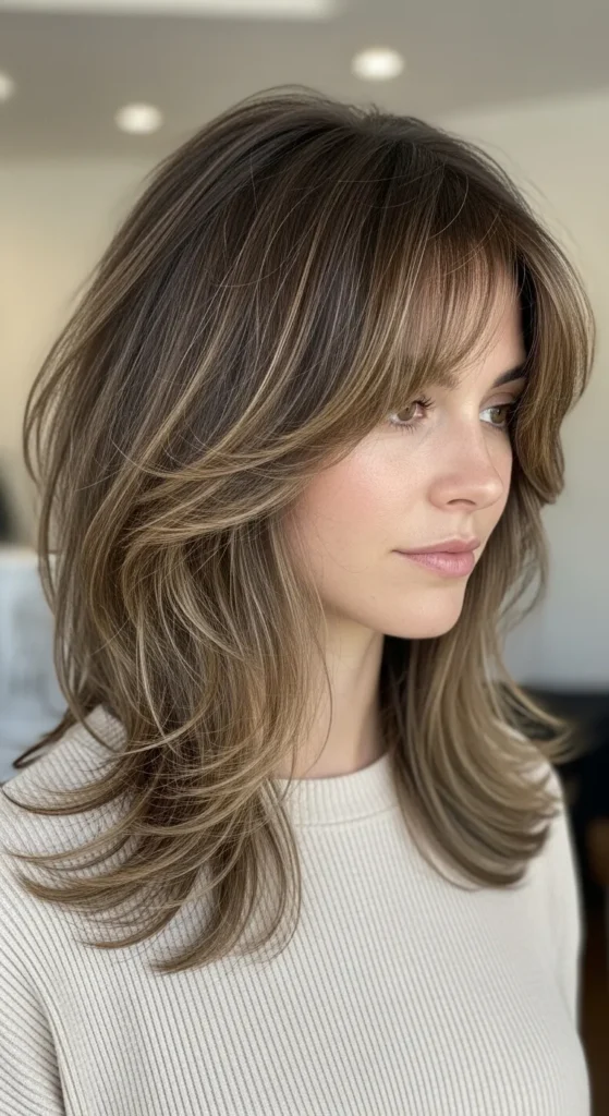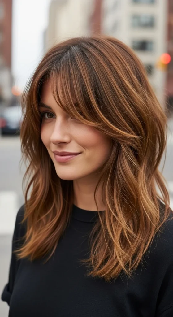 This is a classic Pinterest favorite. Layers throughout the hair add texture, while bangs give it that cool, lived-in vibe. It’s ideal if you want shape without sacrificing length.