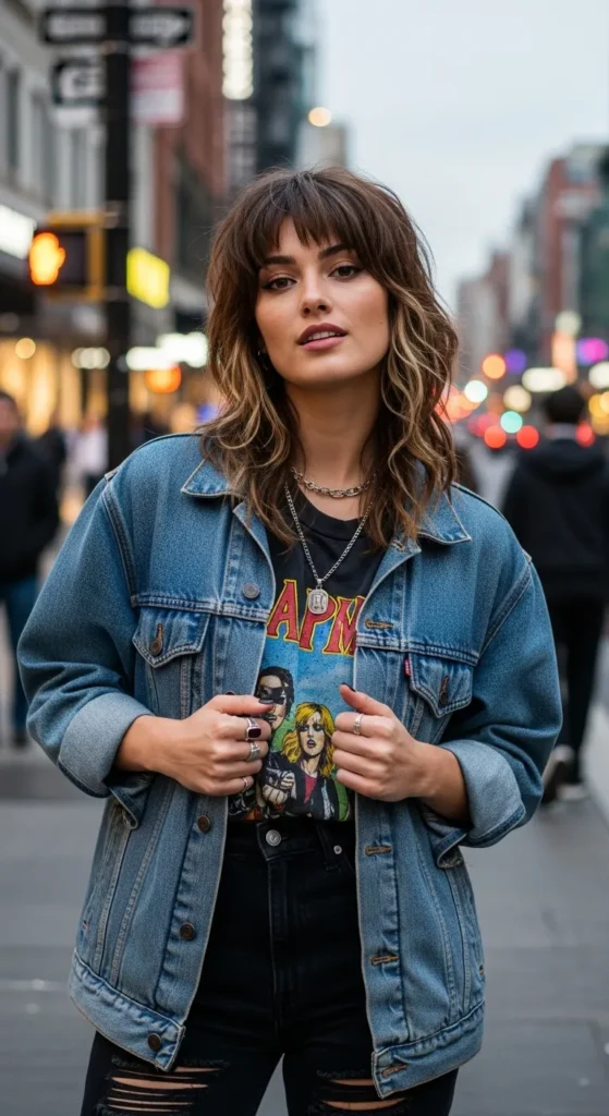 This look blends retro shag vibes with modern softness—perfect for Pinterest trend boards.