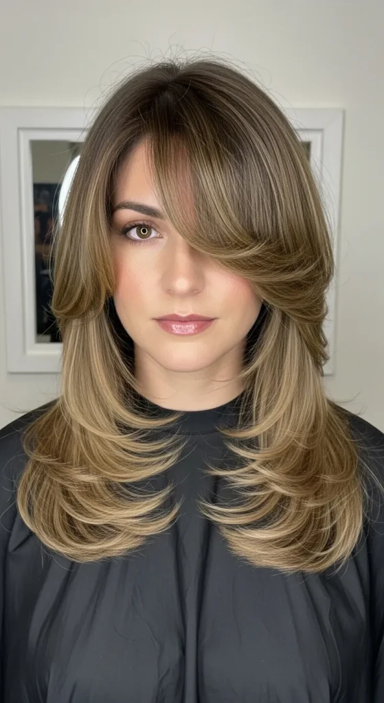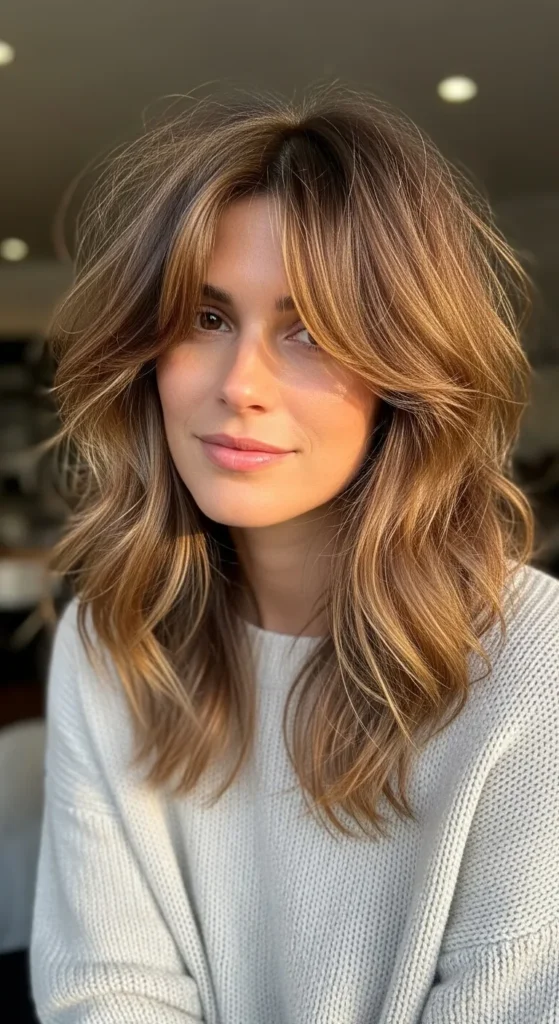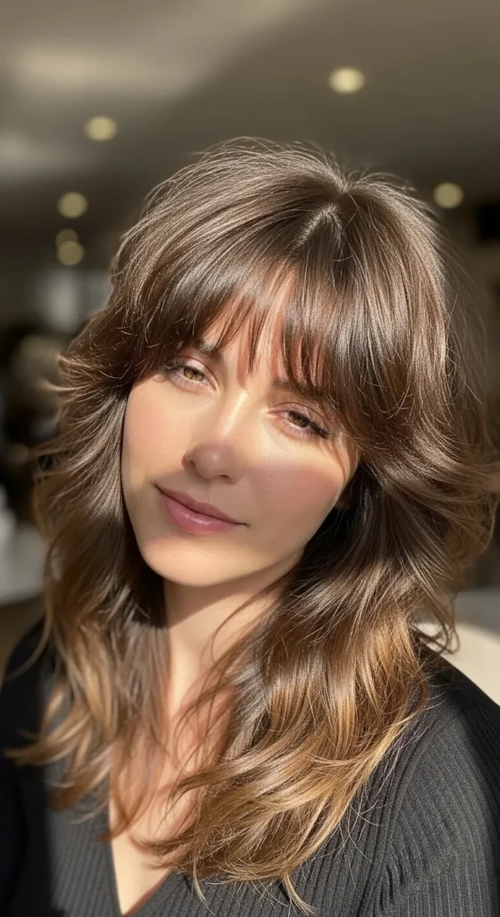 This style is perfect if you want subtle layers and a feminine feel. The soft shag with bangs frames the face gently and works beautifully for everyday wear. It’s easy to style with just a blow-dry and a touch of texture spray.