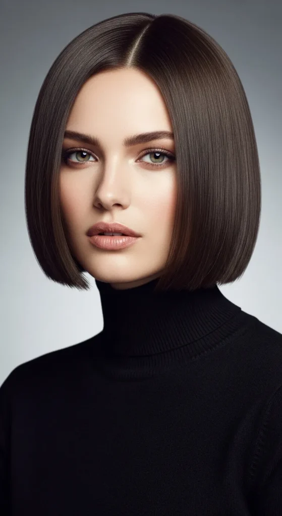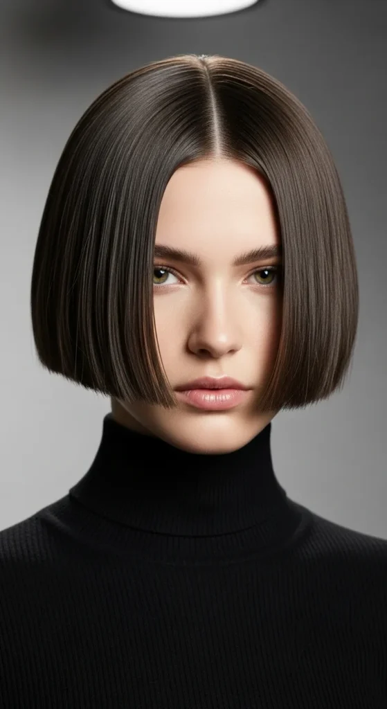 A middle part highlights symmetry and strong blunt lines. This minimalist style makes fine hair look dense and polished, especially in photos.