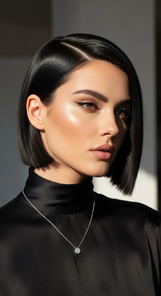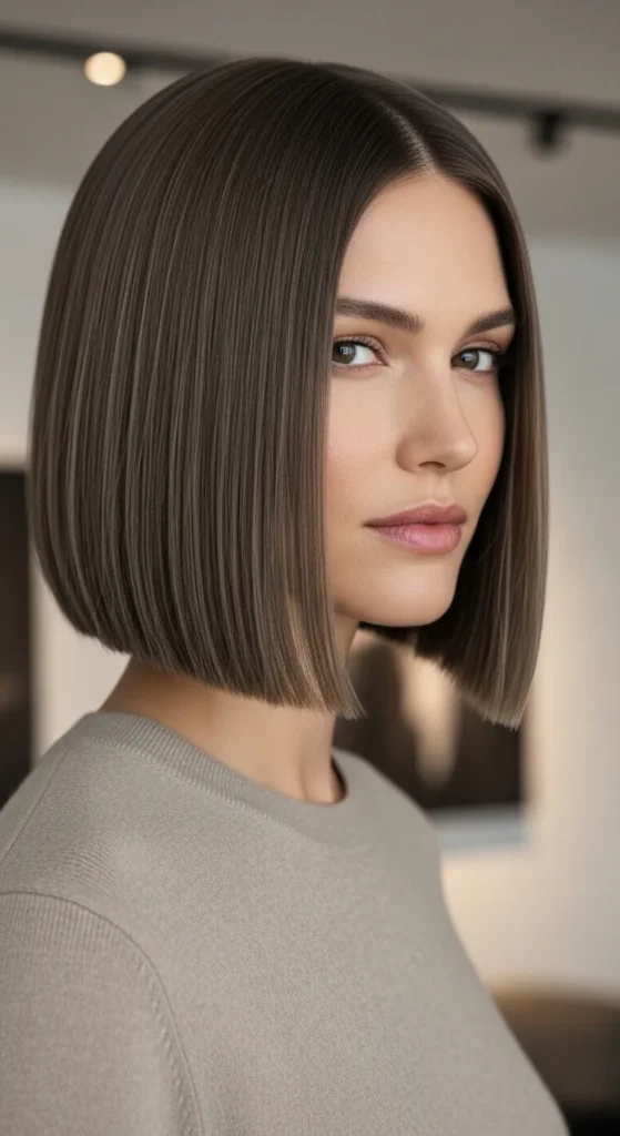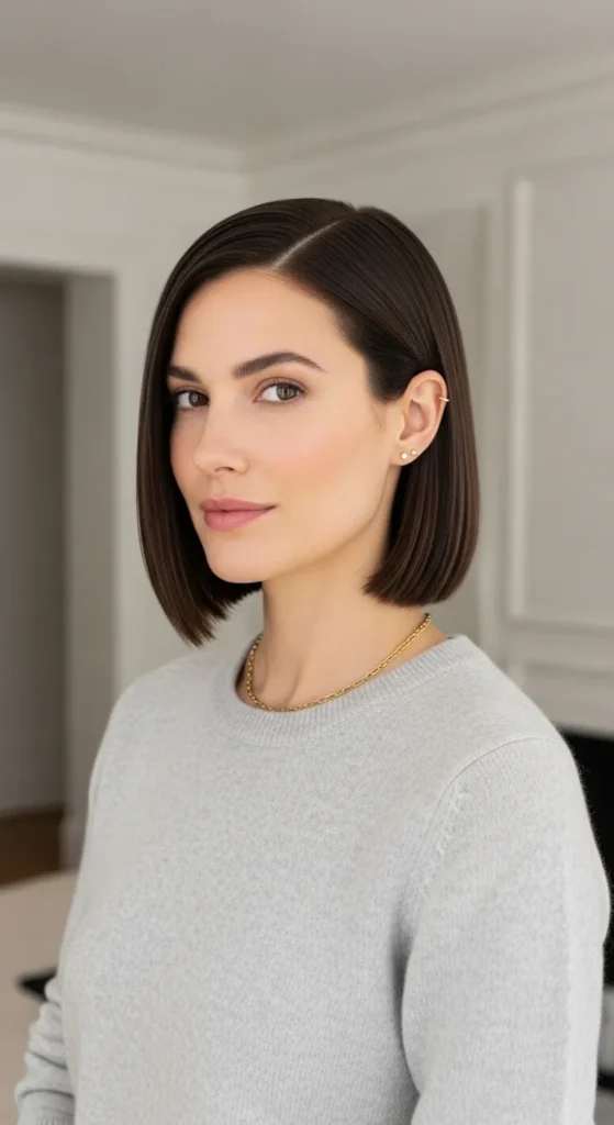 This blunt bob sits right at the jaw or chin, creating a strong yet elegant silhouette. No dramatic layers, no trends—just clean lines and confidence.