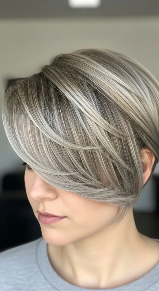 Side-swept styling adds instant softness and elegance to a short cut. It’s flattering for almost every face shape.