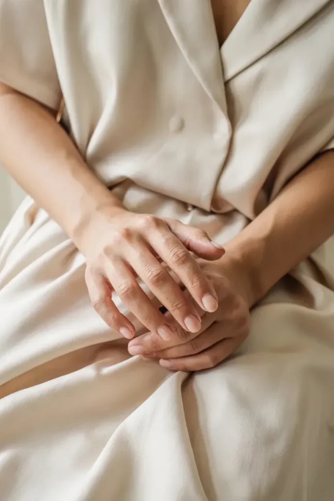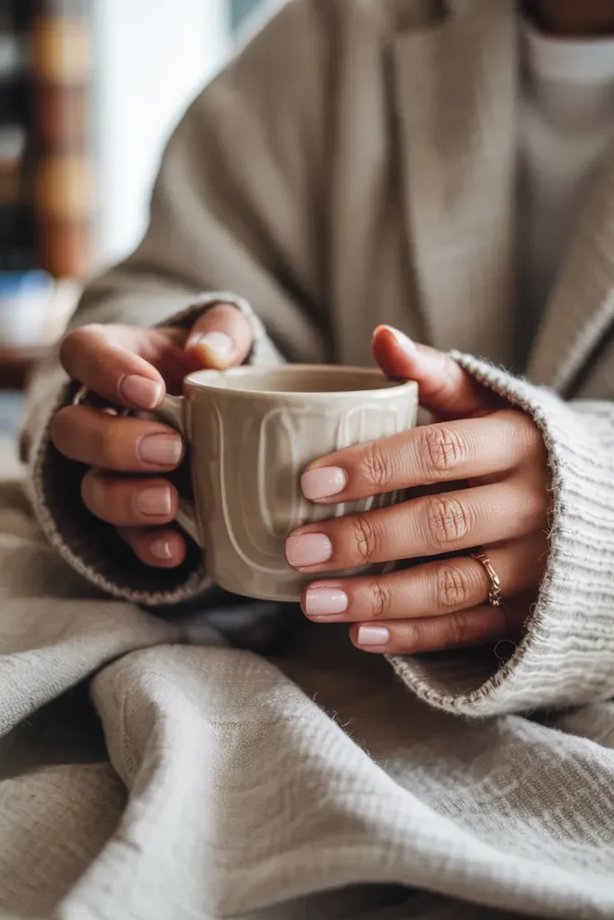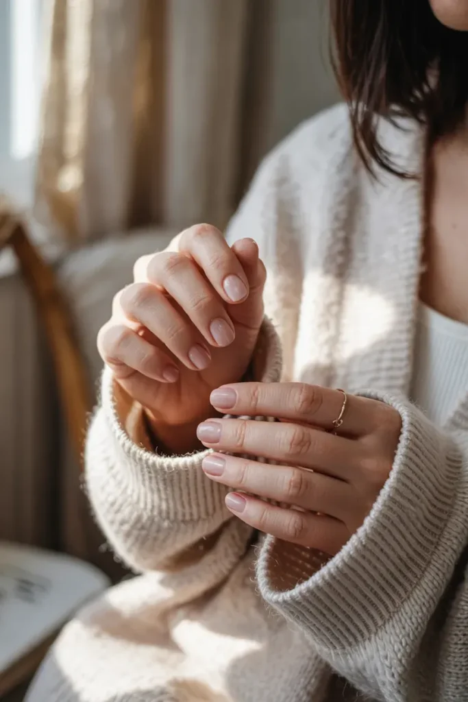 Short almond nails soften the hands while remaining practical. Nude polish enhances the elegant shape without distracting from it.
