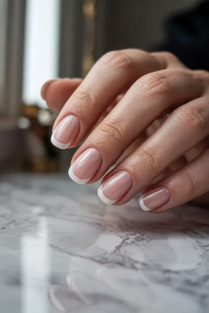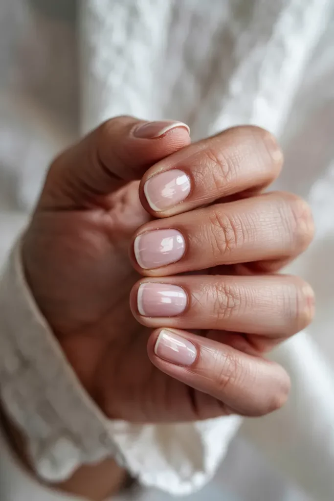 This is the old money version of a French manicure — barely-there white tips over a sheer pink base. Subtle, classic, and never flashy.