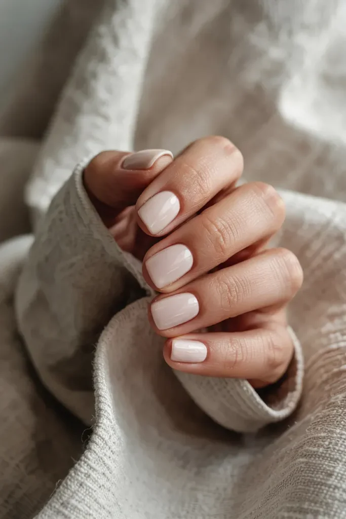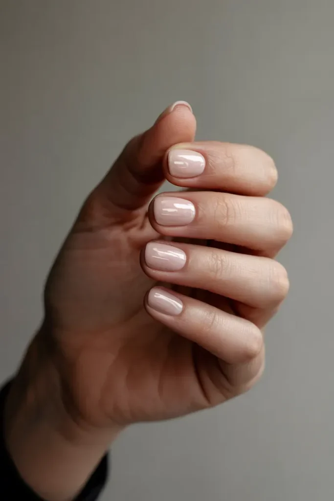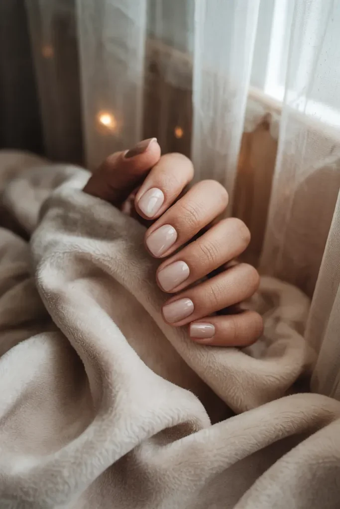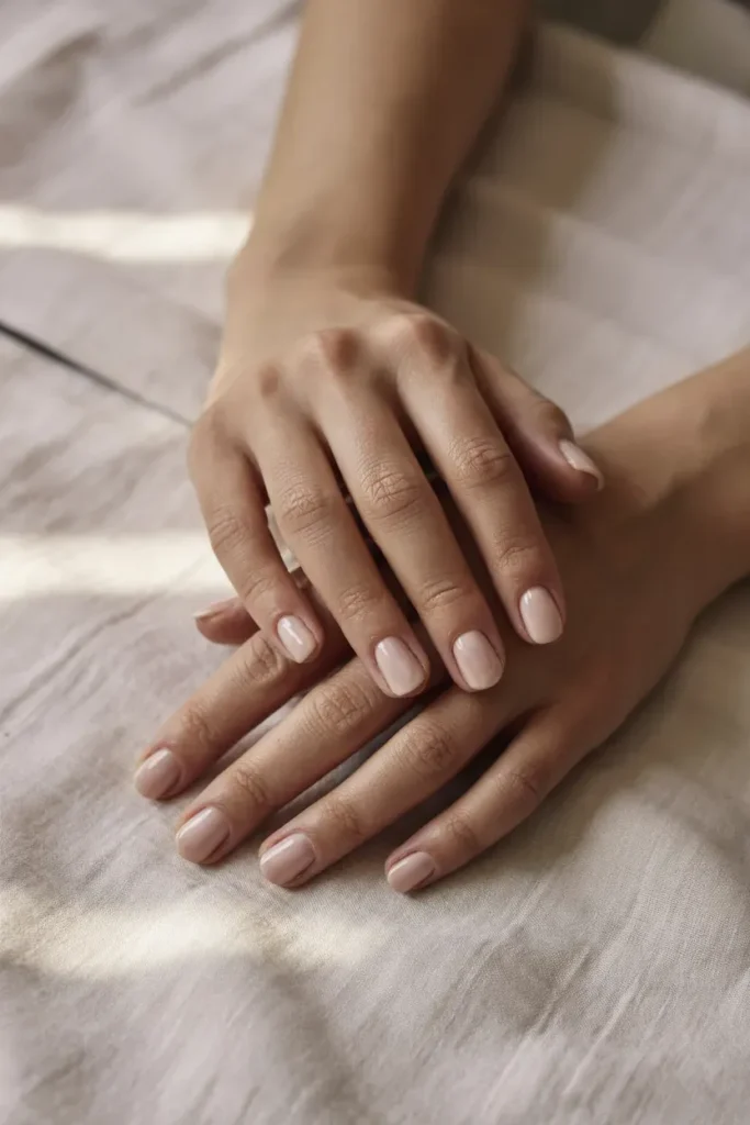 A soft nude polish on rounded short nails creates a gentle, refined silhouette. This style is practical, flattering, and extremely wearable.