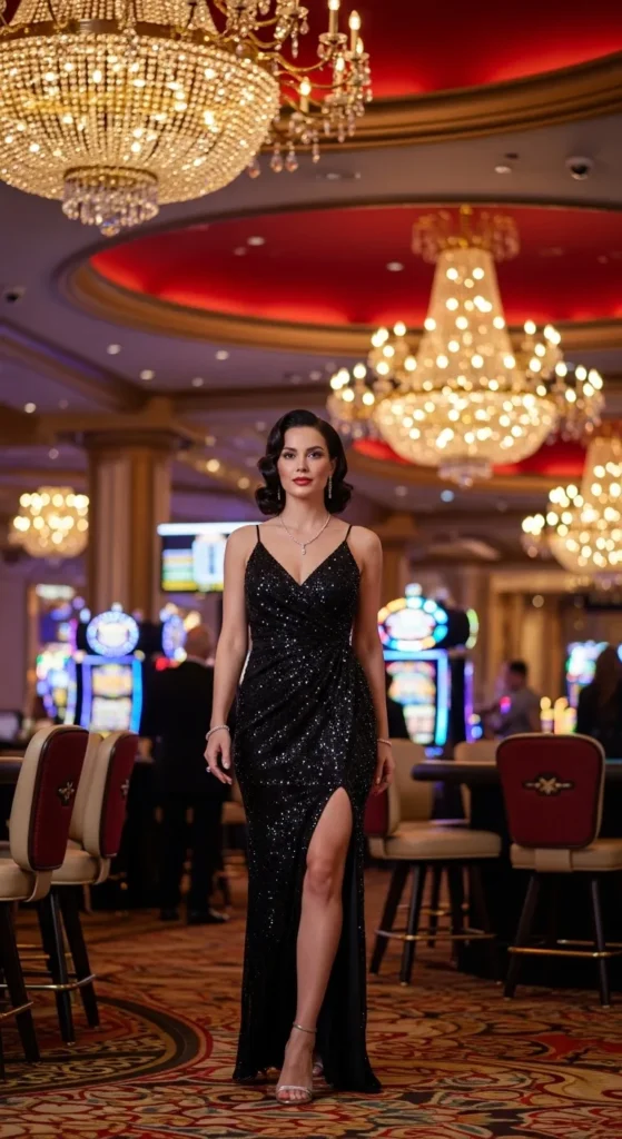 Casino nights call for polished glam—sleek dresses, elegant heels, and refined accessories.