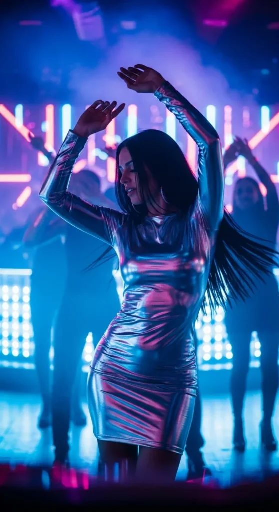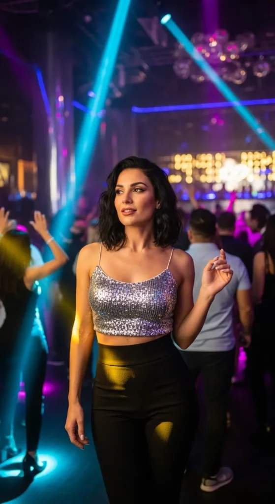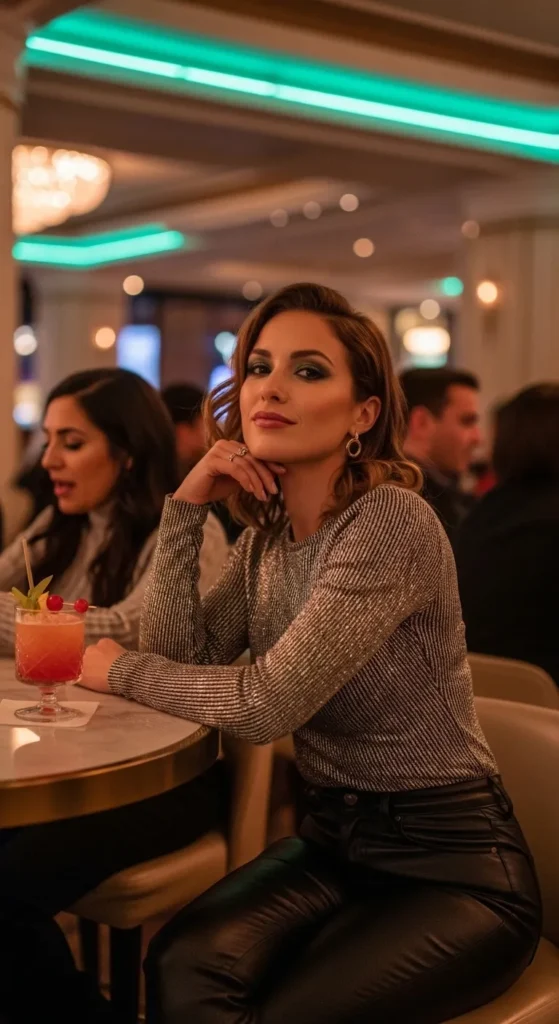 Sequins shine perfectly under club lights without needing extra accessories. Pair a sparkly top with tailored high-waisted pants to balance glam with comfort—ideal for fancy bars and upscale clubs.