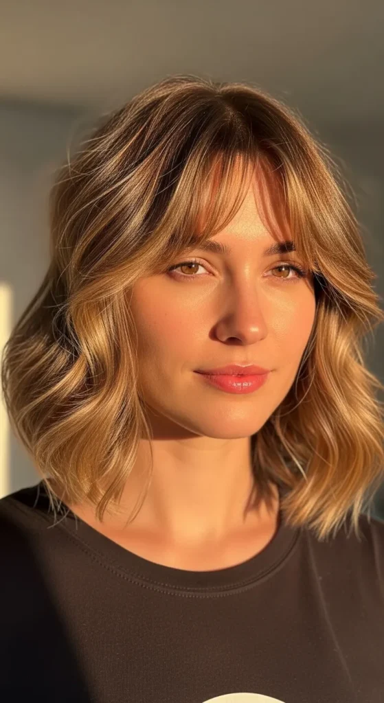 Curtain bangs soften the face and blend seamlessly into waves. This look is flattering, youthful, and incredibly popular on Pinterest.