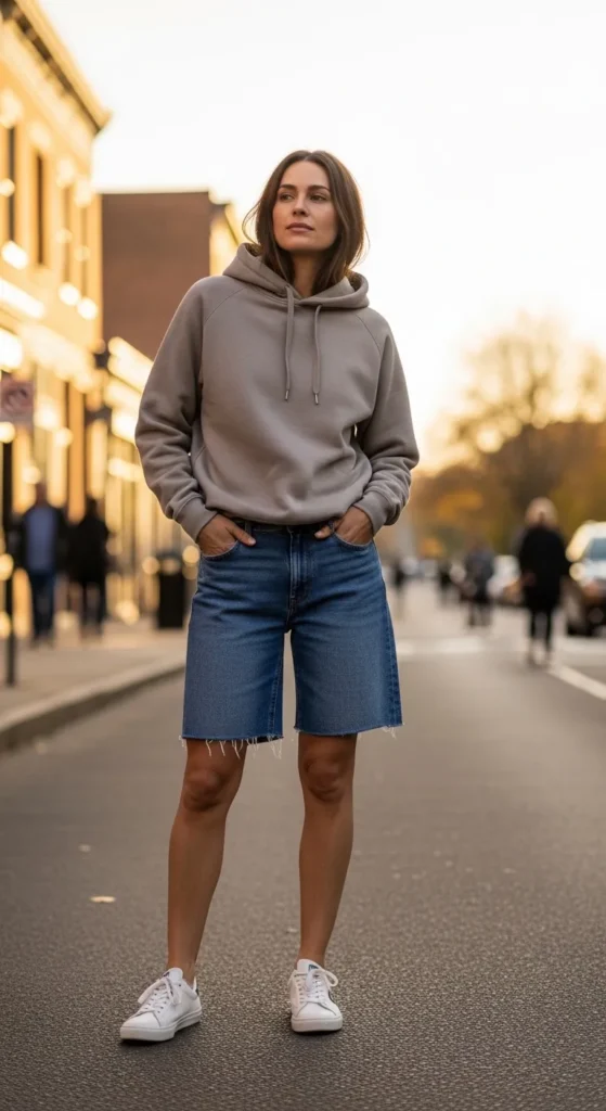 A go-to outfit for laid-back days. Oversized hoodies paired with jorts feel cozy but stylish. This combo is perfect for travel days or casual hangs when comfort is key.