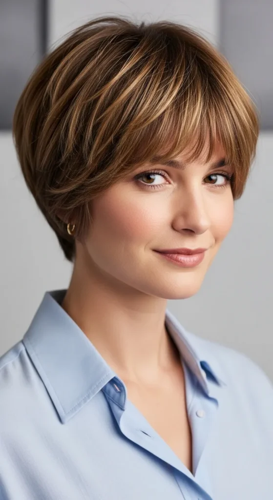 Short hairstyles can feel softer with the addition of wispy bangs. A layered pixie cut with a light fringe creates a chic and feminine look.