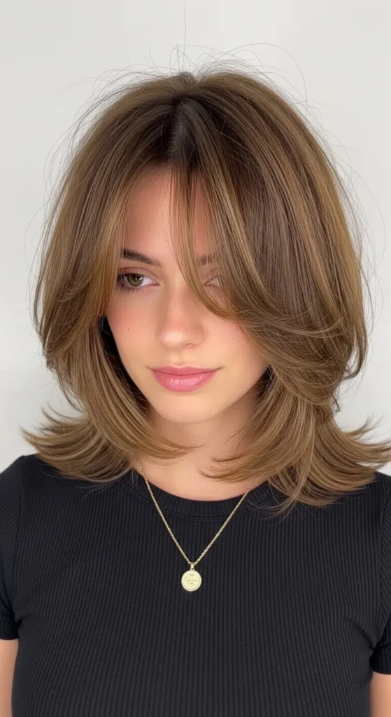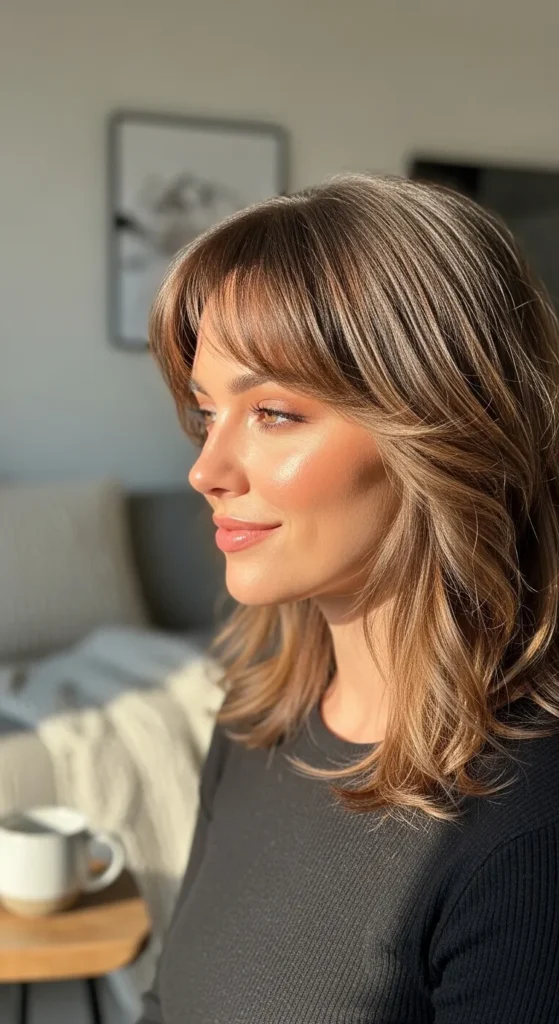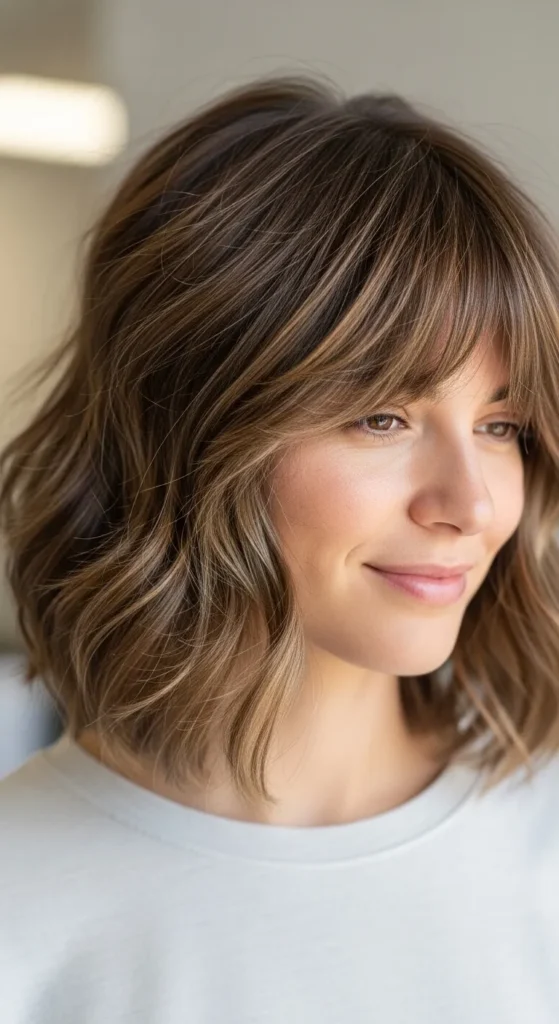 Shoulder-length layered hair with wispy bangs is one of the most practical everyday styles.