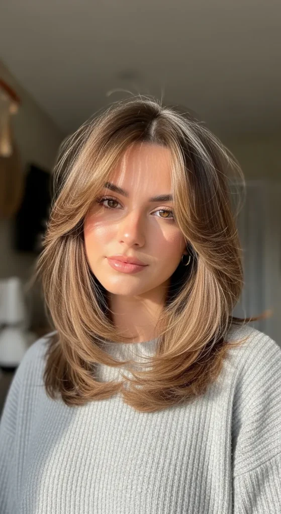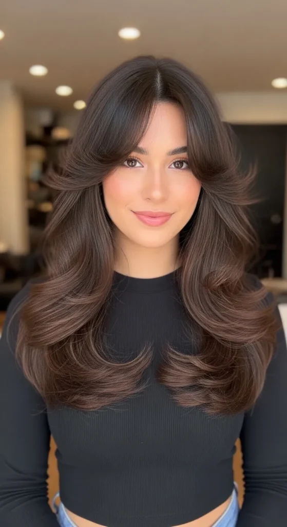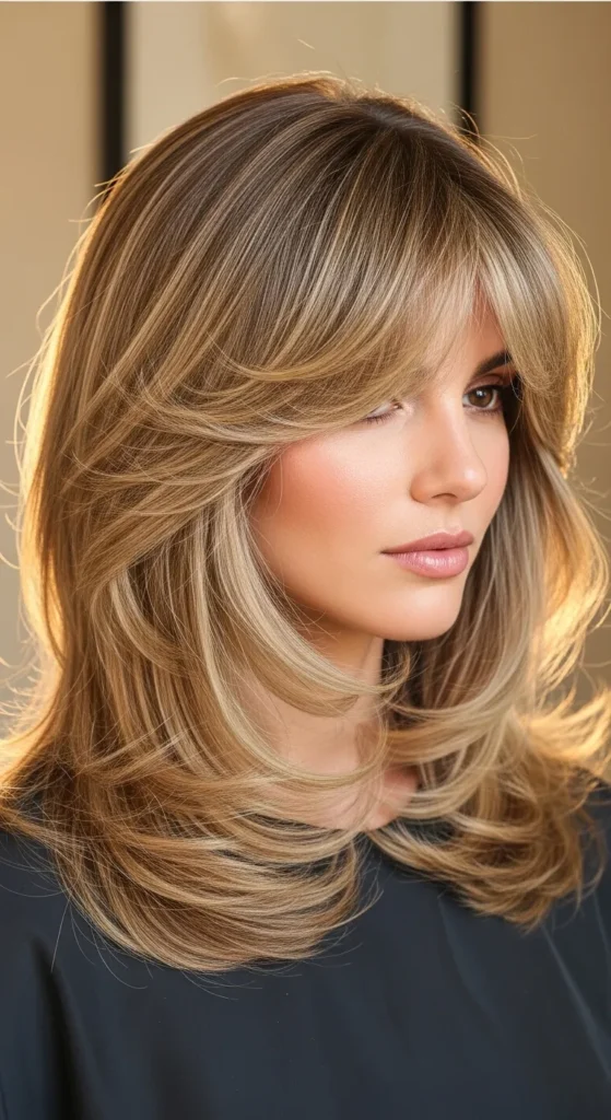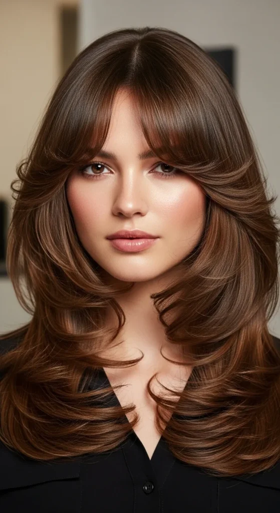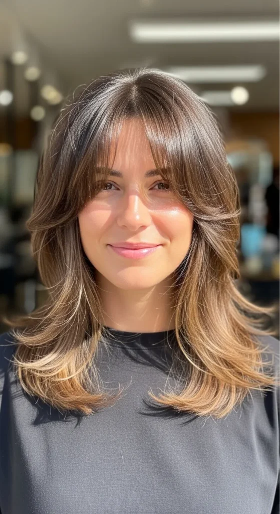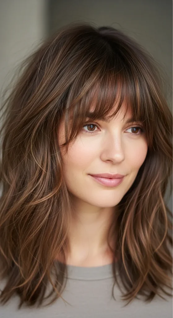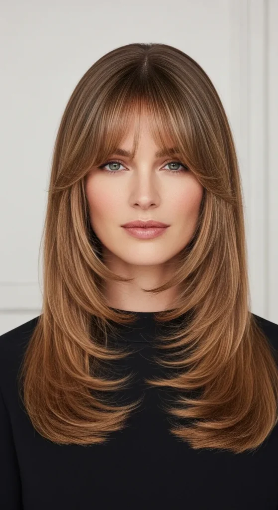 Face-framing layers paired with wispy bangs can instantly highlight your cheekbones and eyes. The light fringe blends beautifully into the front layers, creating a seamless look.