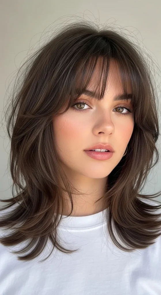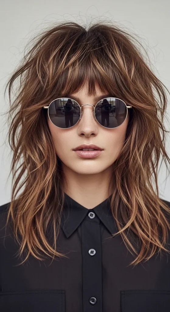 The modern shag haircut pairs perfectly with wispy bangs. The layered texture adds movement, while the fringe keeps the look soft and feminine.