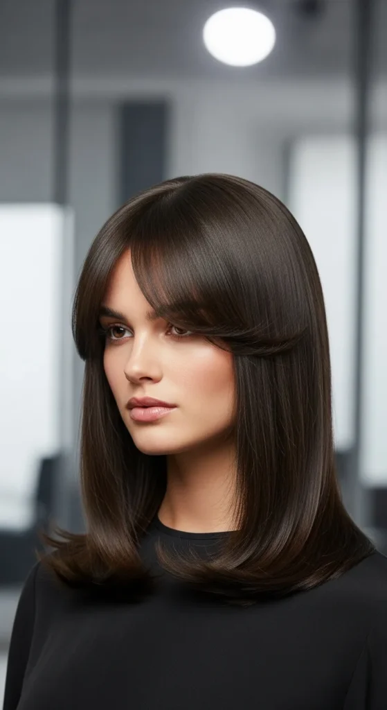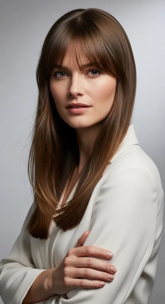 Long straight layers paired with wispy bangs create a polished but modern style. The contrast between the sleek length and light fringe keeps the hairstyle balanced.