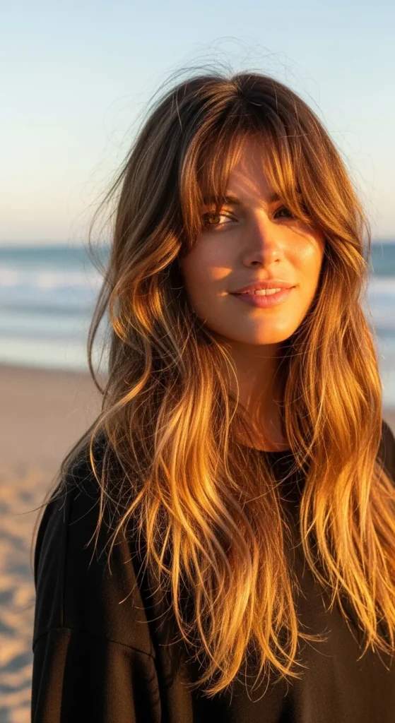 Soft beachy waves paired with wispy bangs create a relaxed, romantic hairstyle that looks straight out of a Pinterest hair inspiration board.