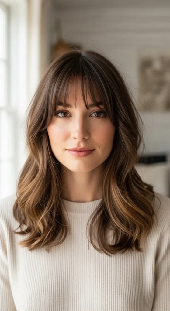 This timeless style combines soft whispy bangs with long layered hair. The layers create movement while the bangs gently frame the eyes. It’s a great option if you want a subtle change without losing length.