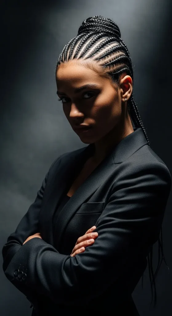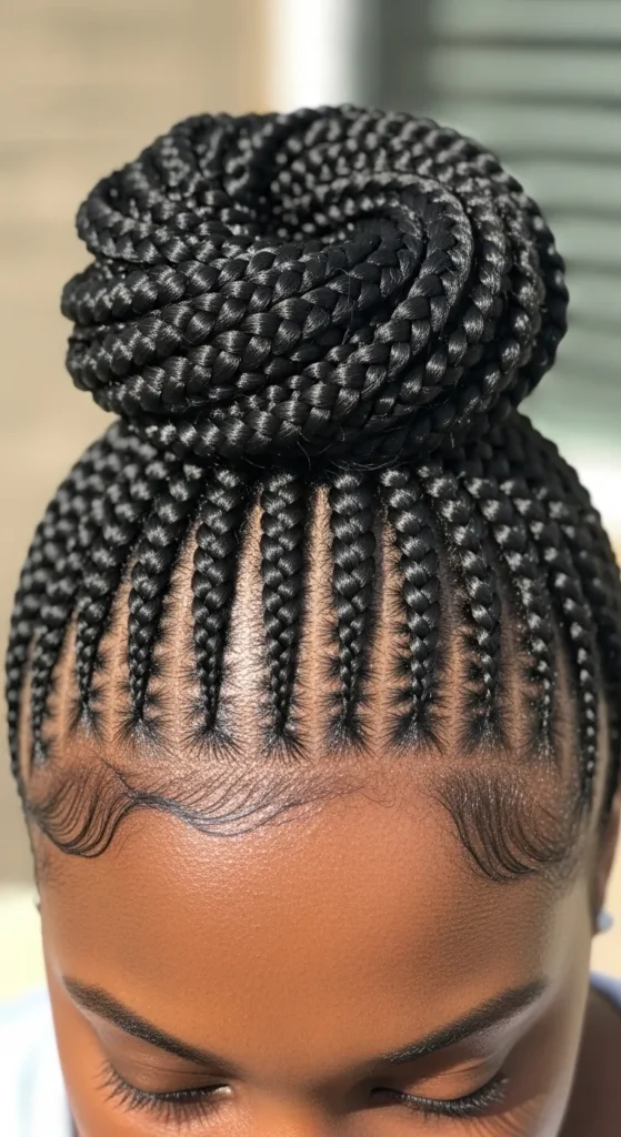 This updo combines elegance and protection. Cornrows add detail at the scalp, while the bun keeps everything neat. It’s ideal for formal occasions or professional settings where you still want a stylish edge.