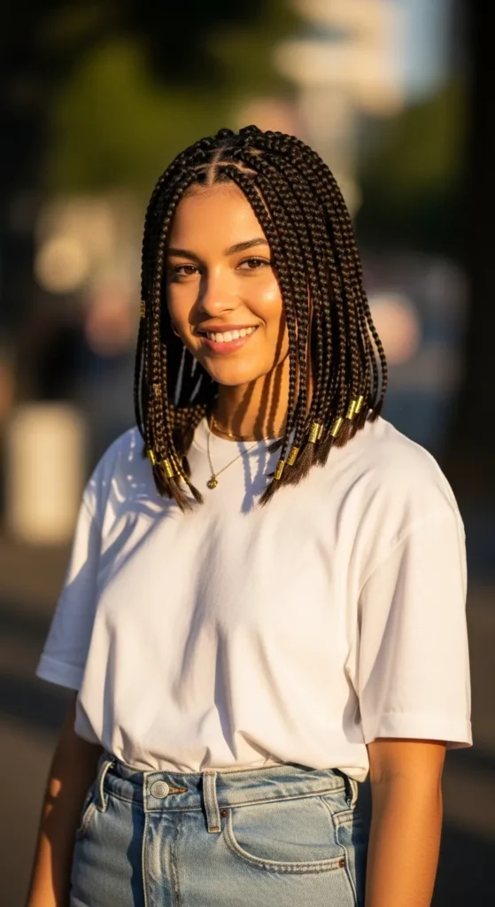 Beads add personality and charm to short braids. Whether clear, wooden, or metallic, they bring attention to the ends and make the style feel playful yet polished. A great option for women who love detail without extra length.