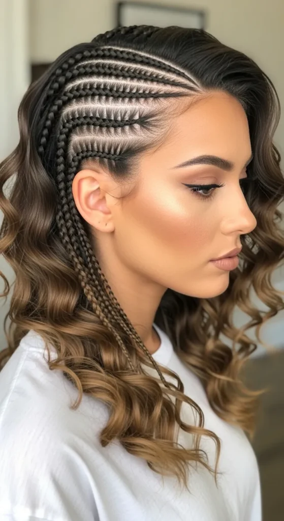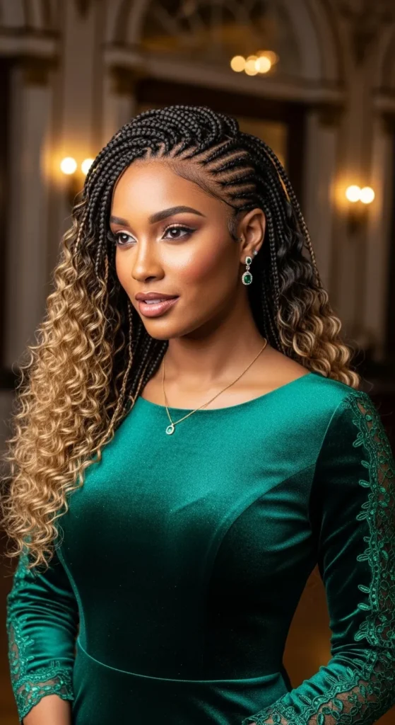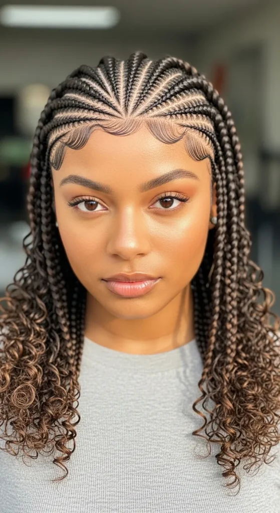 This style blends sleek structure with soft movement. Straight-back braids keep the look clean, while curled ends add volume and femininity.