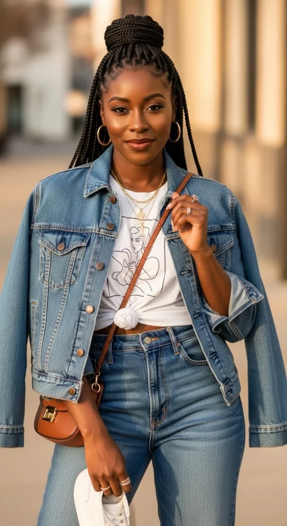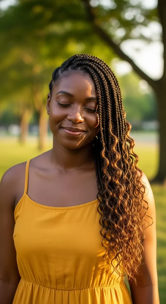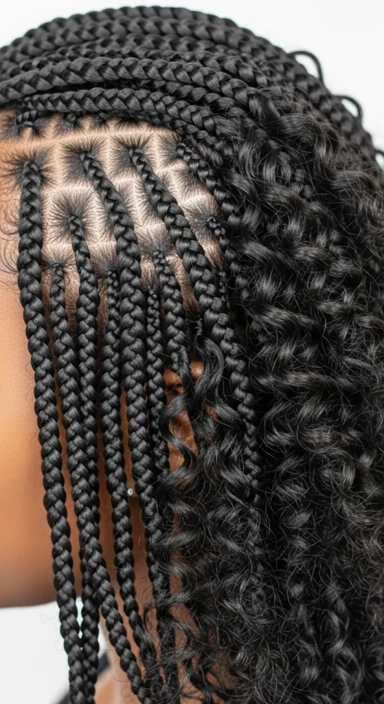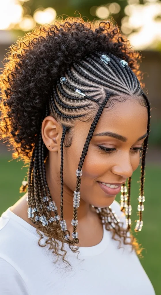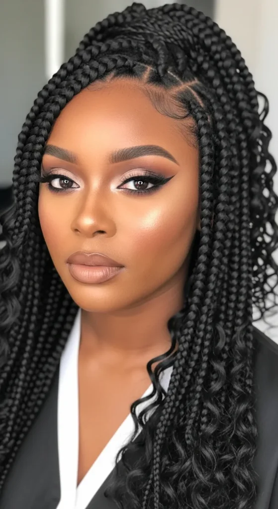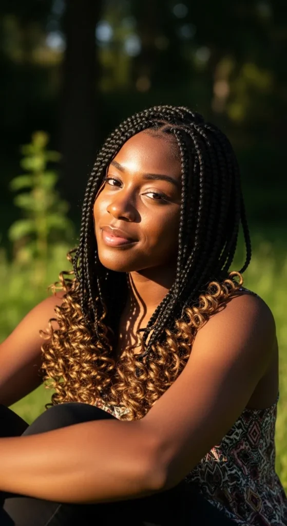 Blending braids with natural curls creates a soft, authentic look. It’s perfect for women who want protective styling without fully covering their texture. This style feels modern, confident, and effortlessly beautiful.