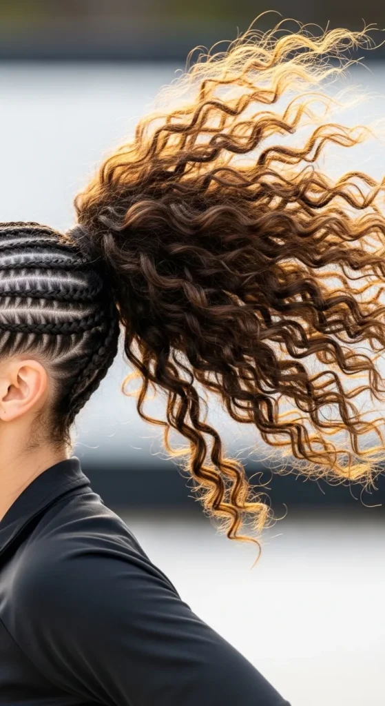 This look keeps braids secure at the scalp while letting curls steal the spotlight in a high or mid ponytail.
