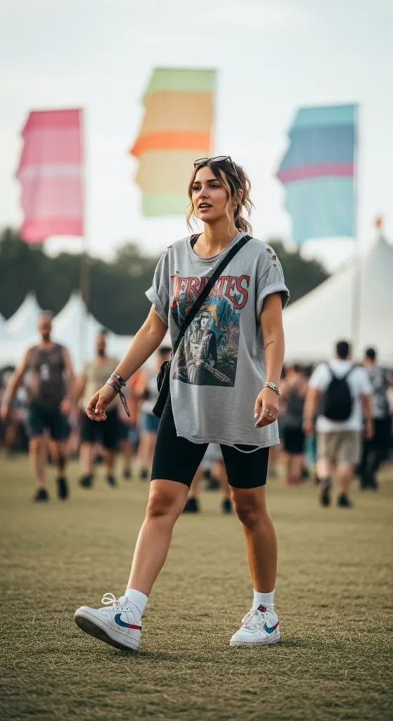 This relaxed look screams cool-girl energy. Choose a vintage-style band tee or bold graphic, half-tuck it, and style with biker shorts.