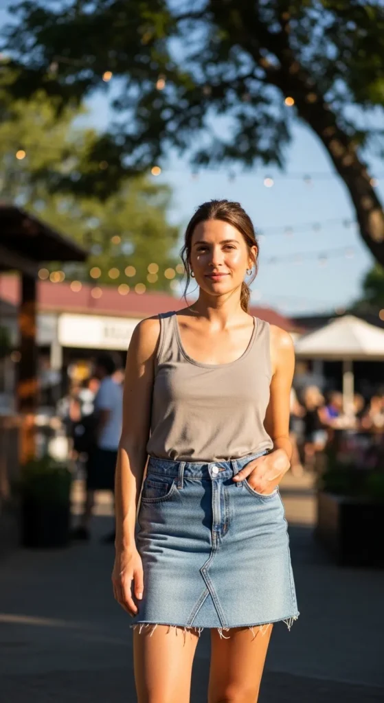 This outfit feels trendy but timeless. A fitted tank balances out a structured denim skirt beautifully. Add ankle boots or platform sandals for a subtle edge. Perfect for daytime concerts or early evening shows.