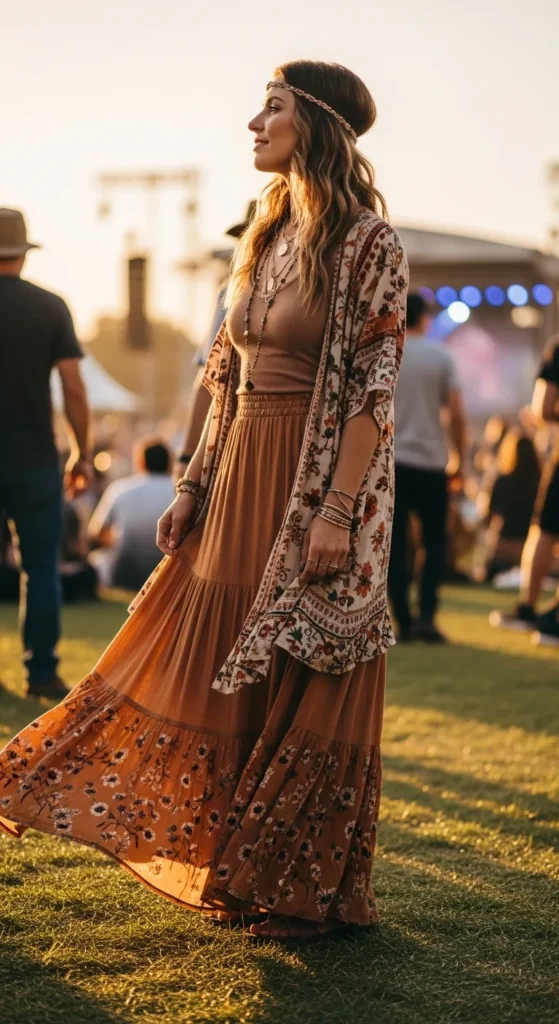 A breezy maxi skirt paired with a cropped tee gives movement and comfort. Choose lightweight fabrics to stay cool and add platform sandals or sneakers depending on the venue.