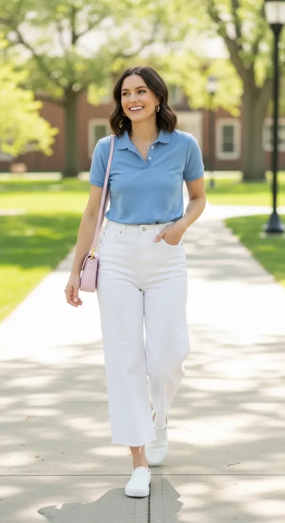 Polos are having a major moment and they look incredible tucked into wide leg jeans. A pastel or stripe polo with high waist denim gives you preppy-meets-modern energy. Slip-on sneakers make it casual, comfortable, and wearable every single day.