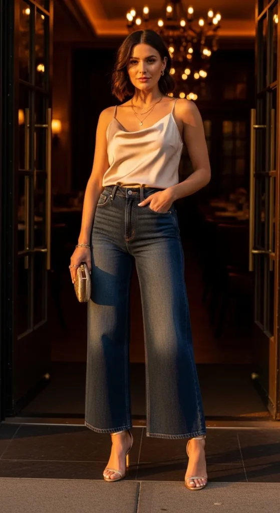 7. Satin Cami + High Waist Wide Leg Jeans + Strappy Heels