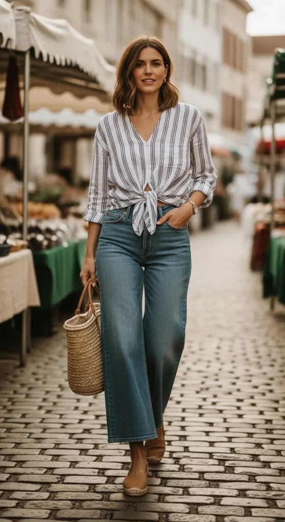 Stripes and denim are a spring classic for a reason. Choose a relaxed linen stripe top — tucked in front — and finish with tan espadrilles. This combo feels breezy, French-girl chic, and works perfectly for a casual day out or weekend farmers market trip.