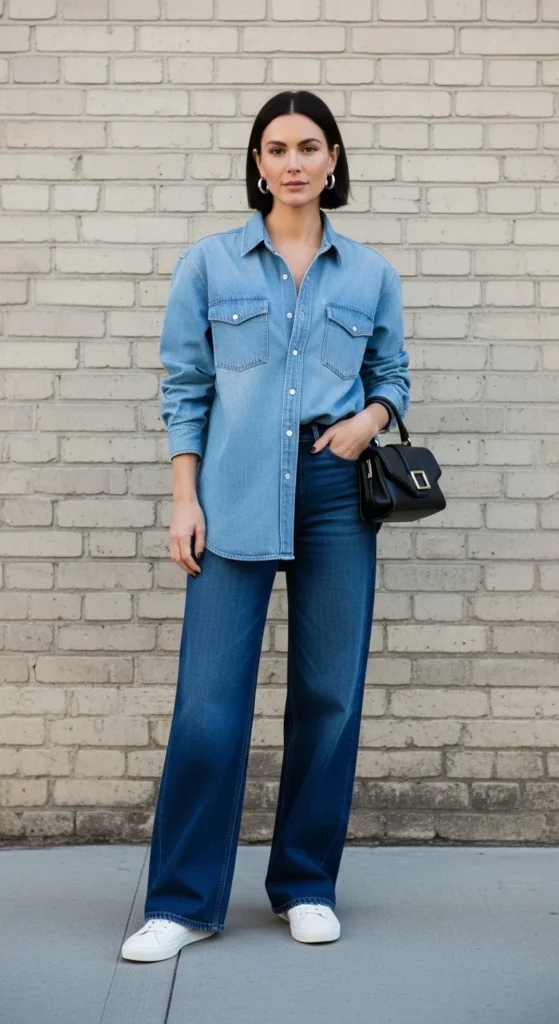 Yes, double denim is back and thriving. Pair a light wash denim shirt (loosely buttoned, slightly oversized) with darker wide leg jeans. Keep sneakers white and accessories minimal. It’s one of those spring outfits that always looks better in person than it sounds on paper.