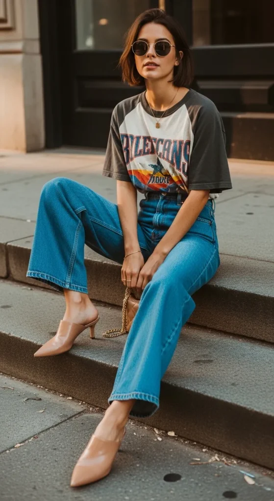 5. Oversized Graphic Tee + Wide Leg Jeans + Mules