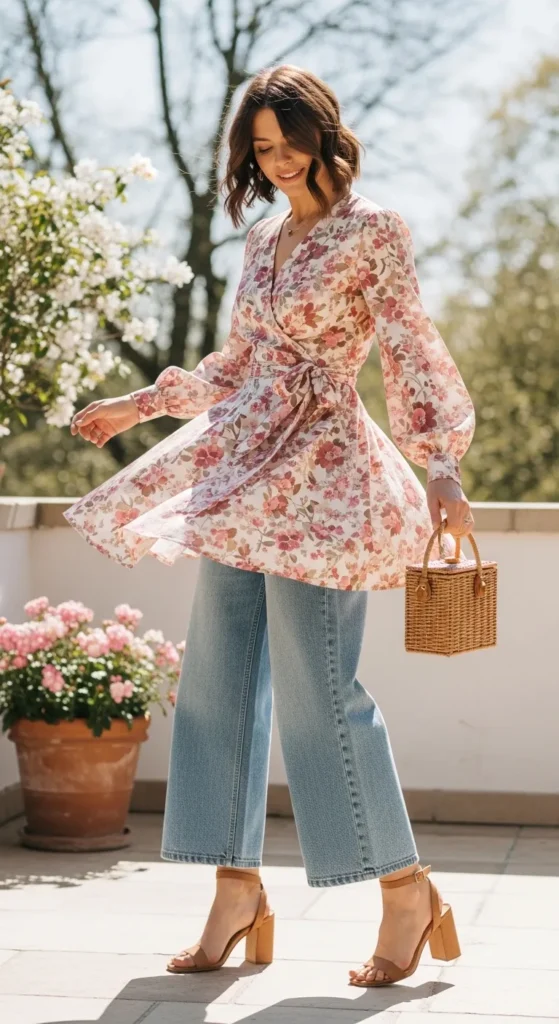 Florals for spring? Always. A wrap blouse with a subtle floral print adds femininity and movement to wide leg jeans. Block heels keep it practical and chic. This is the kind of look that photographs beautifully and gets saved thousands of times on Pinterest.
