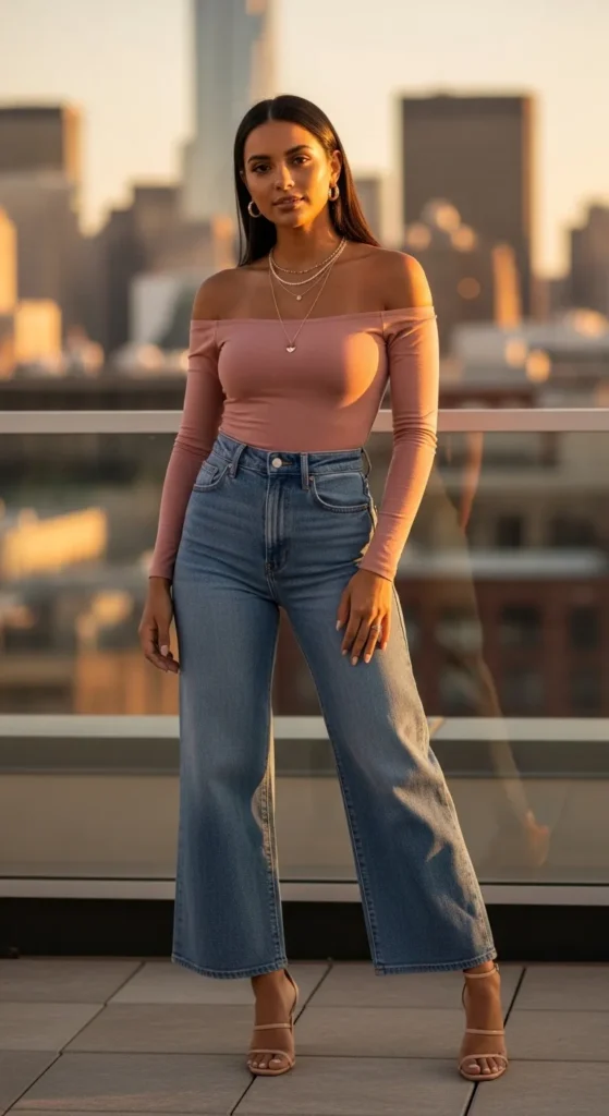 An off-shoulder top with high waist wide leg jeans creates an hourglass silhouette that’s genuinely stunning. Choose a solid color top and let the jeans be the statement. Heeled sandals lengthen the legs even further. Add a simple pendant necklace and you’re done.