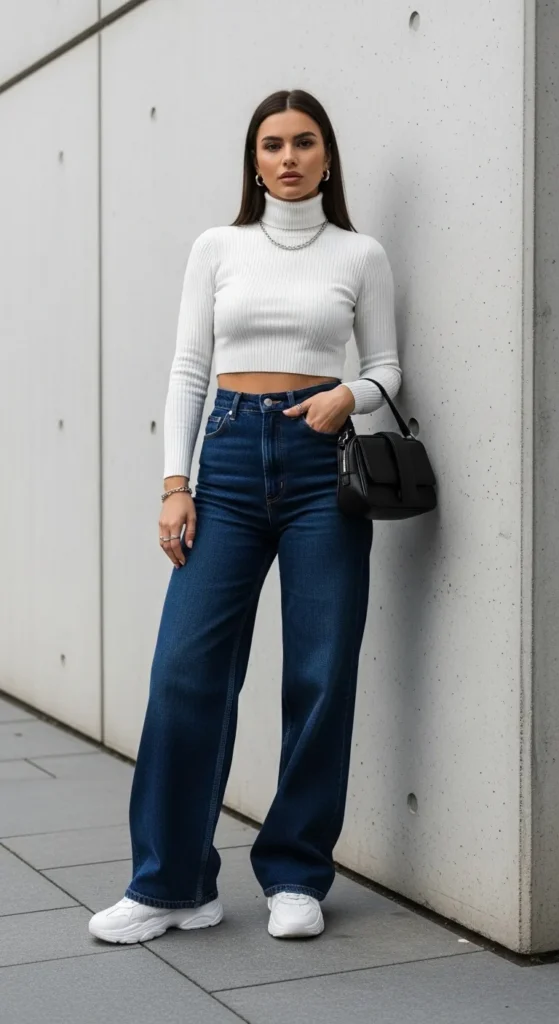 15. Turtleneck Crop Top + High Waist Wide Leg Jeans + Sneakers