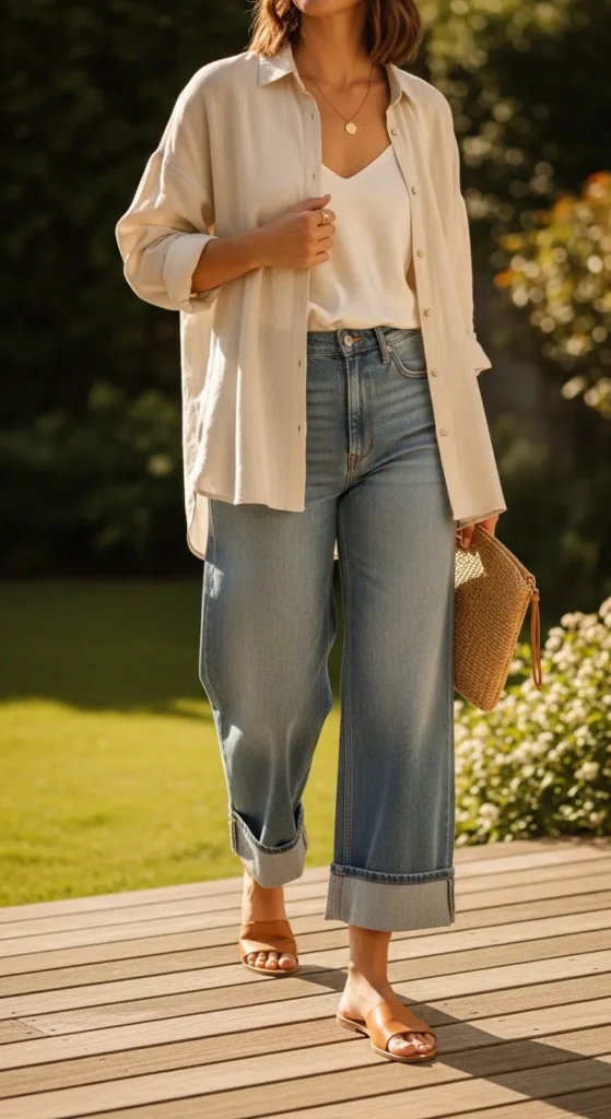 14. Oversized Linen Shirt + Wide Leg Jeans + Sandals