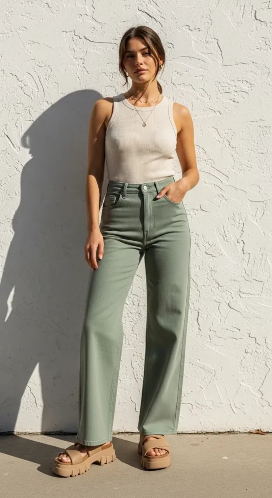 A fitted ribbed tank balanced against a wide, flowy leg creates the most flattering silhouette. Go for a neutral tank — cream, beige, or sage — and let the jeans do the talking. Chunky platform sandals add that trendy spring touch without much effort.