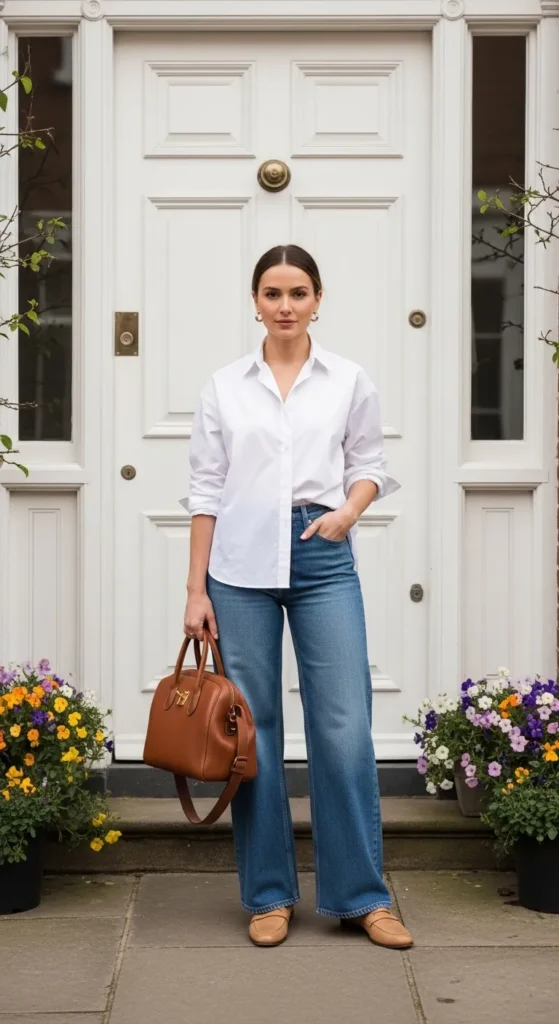 The half-tuck is the move here. A crisp white or soft blue button-down half-tucked into wide leg jeans gives you that casual French aesthetic without even trying. Loafers in tan or black complete the look. Add a structured tote and it’s office-lunch-ready.