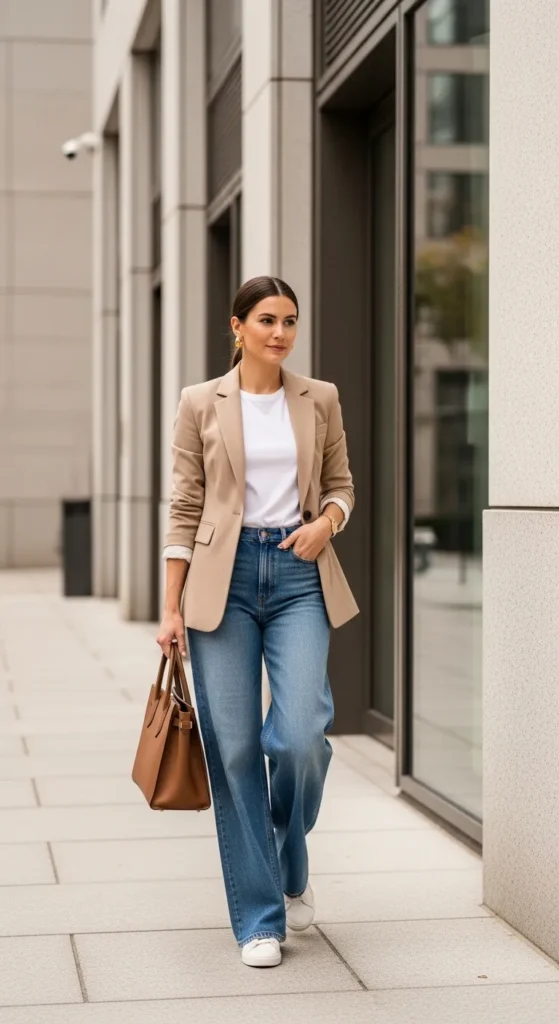 Blazers make everything look more expensive — and this combination proves it. A fitted blazer in beige, cream, or soft terracotta over a simple white tee tucked into wide leg jeans is effortlessly polished. Great for spring work outfits or a smart casual dinner.
