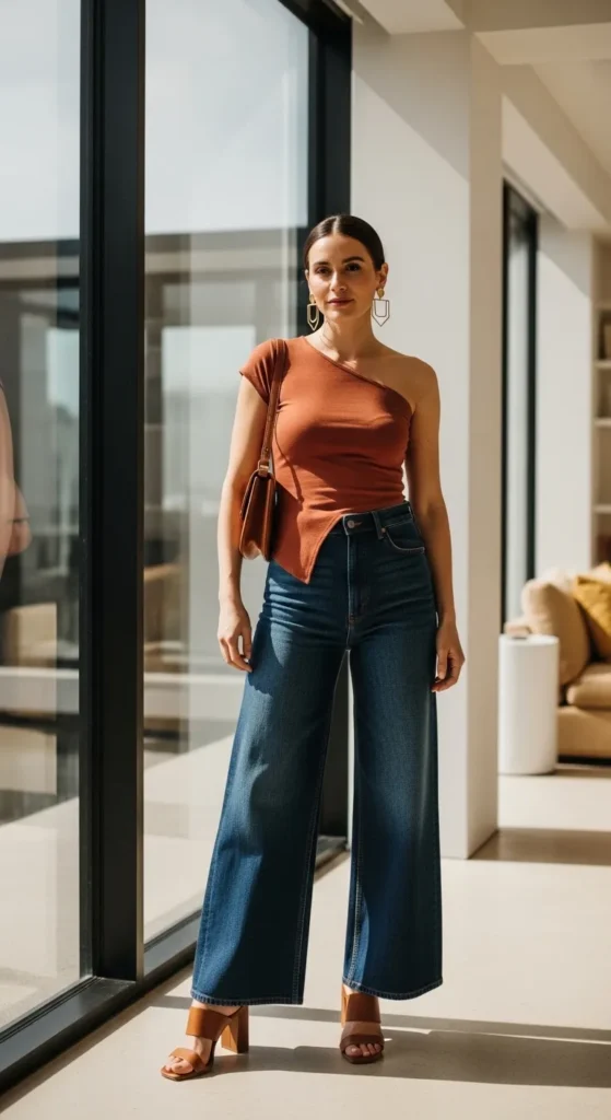 Tops with asymmetric or curved hems naturally draw attention to the waist and hips — making them the perfect partner for high waist wide leg jeans. Choose a solid-color asymmetric top and add block heeled sandals for a modern, fashion-forward spring outfit.