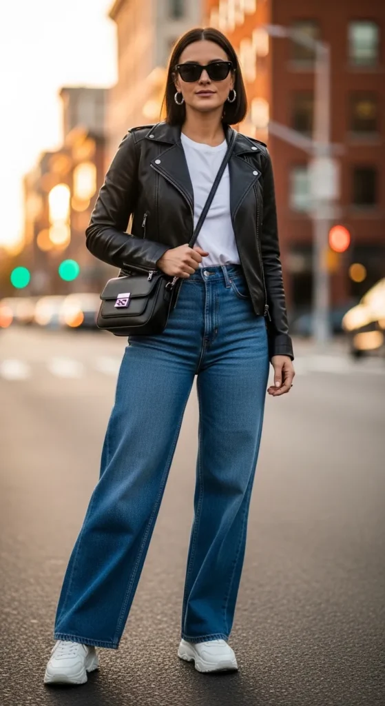End the list with a classic for a reason. A fitted leather jacket over a white tee tucked into high waist wide leg jeans with clean white sneakers is the outfit. It works for spring evenings, casual hangouts, or literally any occasion where you want to look cool without trying.