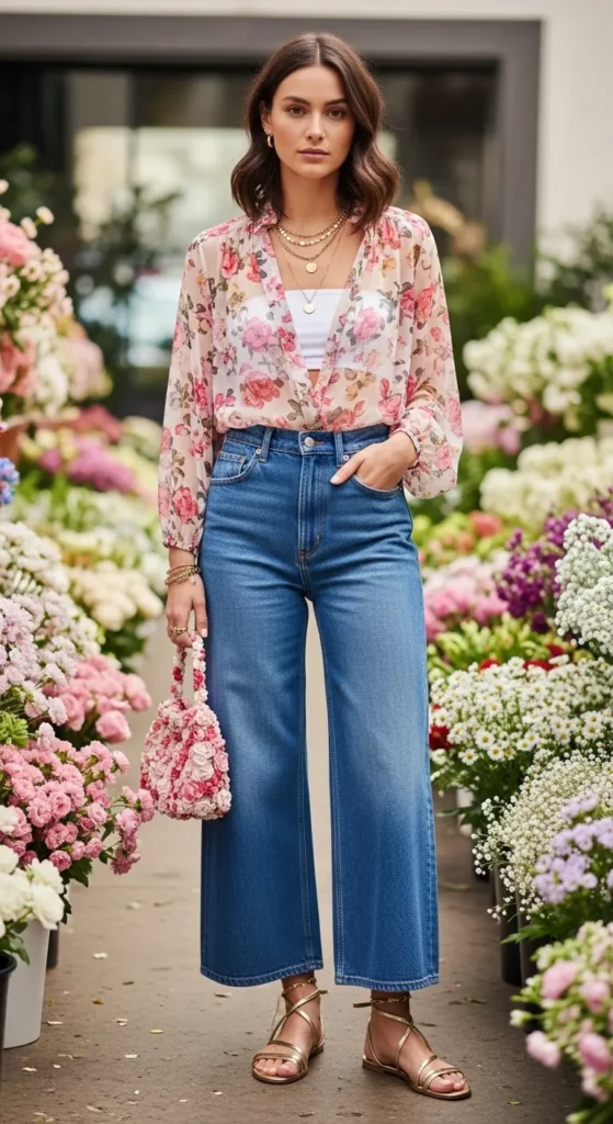 Layer a sheer floral blouse over a simple bandeau top tucked into high waist wide leg jeans. It’s romantic, effortless, and looks like a Pinterest mood board in real life. Add gold jewelry and strappy sandals for a look that feels genuinely expensive.
