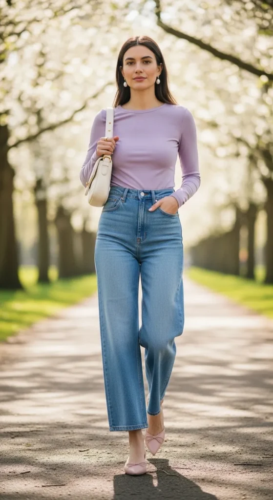 Not every spring day is warm — and this outfit gets it. A fitted long-sleeve top in a soft pastel tucked into high waist jeans creates a sleek, elegant silhouette. Ballet flats bring it all together with that quiet luxury feel that’s genuinely everywhere right now.